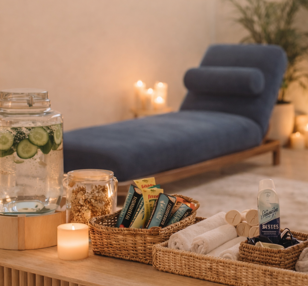Every detail has been thoughtfully considered - from extra hair ties and dry shampoo to small touches like healthy snacks to go and cucumber water from our hydration station on your way out.